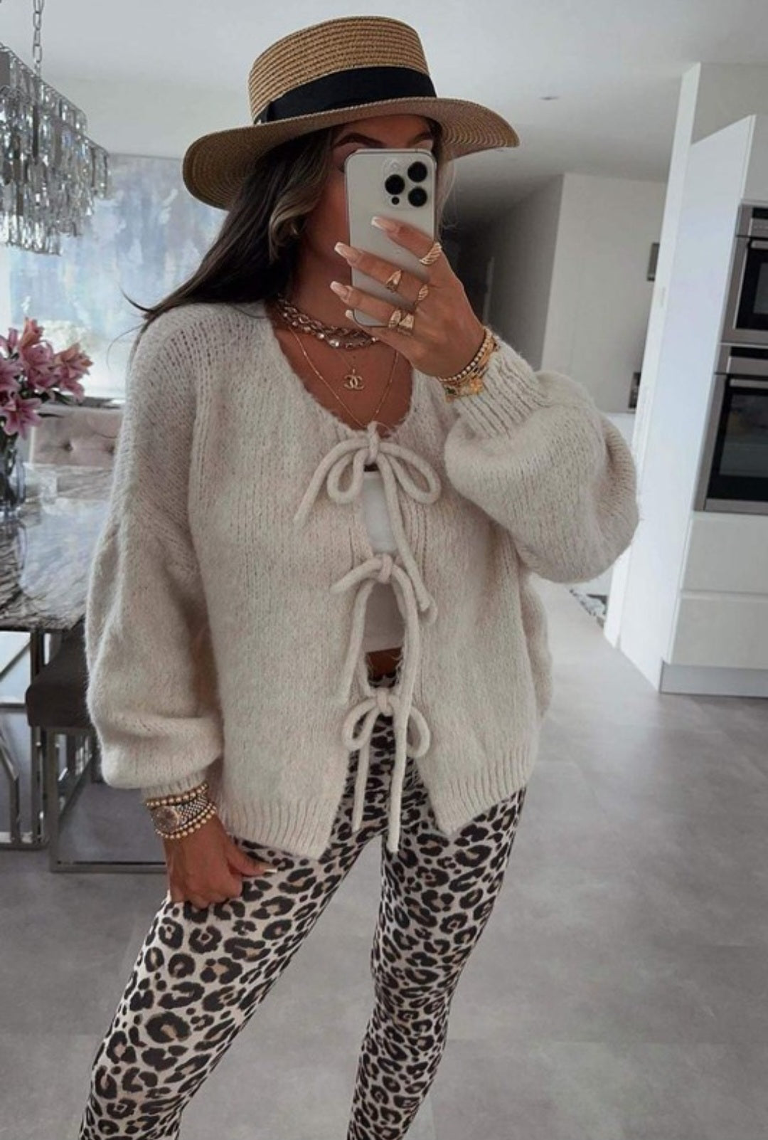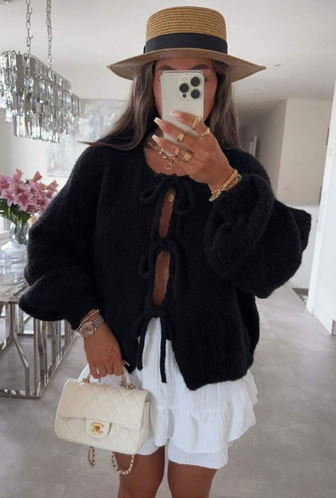 Elevate your winter or spring wardrobe with this chic and cozy cardigan. Soft and fluffy with playful bow-tie closures, this piece adds a touch of femininity and charm to any outfit. Available in black and khaki